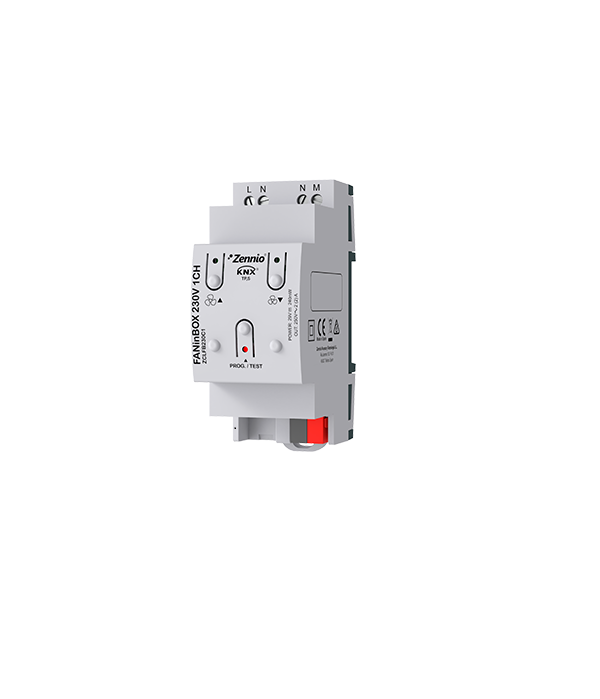 Contrôleur pour ventilateur de plafond alimenté en 230 VAC (2 unités de rail DIN). Il permet le contrôle de jusqu’à 4 vitesses de ventilation et le contrôle manuel des sorties avec indication d’état au moyen de LEDs. Il inclut un module de 10 fonctions logiques et un indicateur d’erreur de panne d’alimentation.