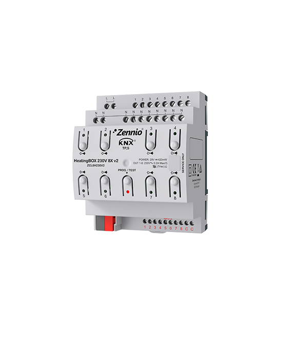 Actionneur pour circuits d’eau climatisée qui permet le contrôle de jusqu’à 8 sorties pour vannes tout-ou-rien à 230 V AC au moyen de triacs avec protection contre court-circuit. Il inclut un thermostat indépendant pour chaque sortie, en plus d’un module de 10 fonctions logiques et 8 entrées analogiques-numériques. Il dispose d’une unique entrée d’alimentation pour toutes les sorties, ainsi qu’un neutre commun pour faciliter l’installation des vannes. Il permet le contrôle manuel des sorties avec indication d’état au moyen de LEDs.