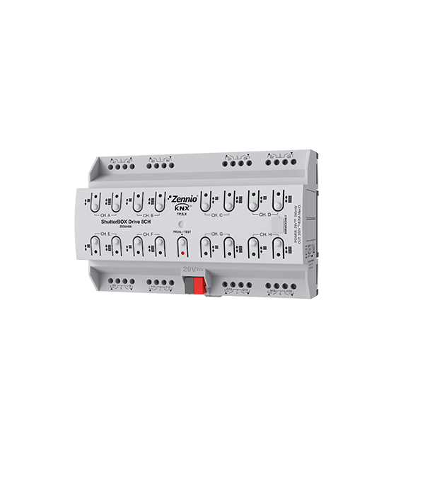 Actionneur de volets de 8 canaux pour rail DIN (8 unités), permettant la mesure automatique des temps de montée/descente, grâce à la détection de courant.